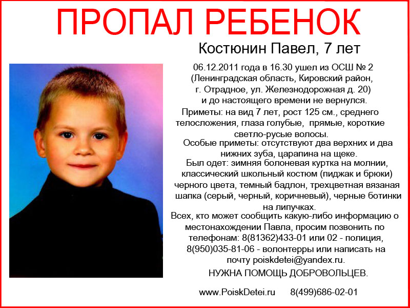 Питер всем миром ищем пропавшего мальчика 7-ми лет - Павла Костюнина, который 6 декабря 2011 вышел из школы после продленки, но домой так и не пришел. Случилось это в г. Отрадное под Петербургом.