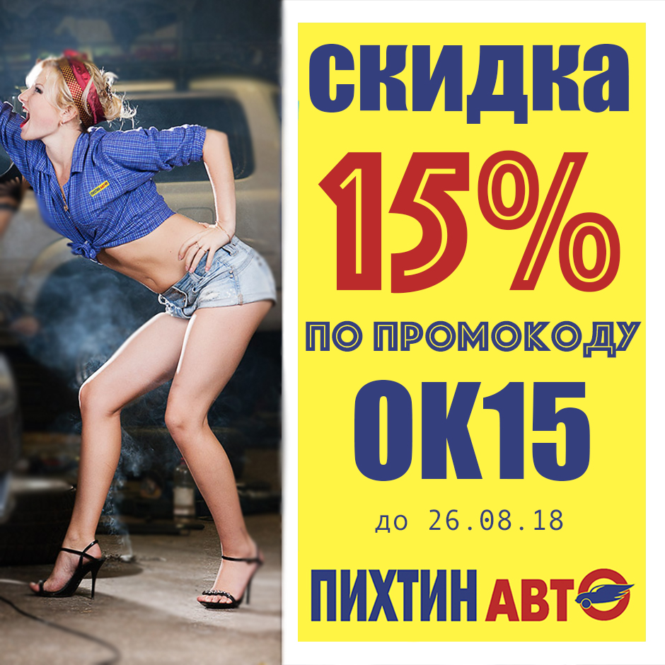 Промокод на скидку 15% в автосервисах ПихтинАвтоСкидка распространяется на ремонт и обслуживание автомобилей в ПихтинАвто и на запчасти в наличии при обслуживании в наших автосервисах. того что бы получить скидку сообщите менеджеру автосервиса промокод ОК15