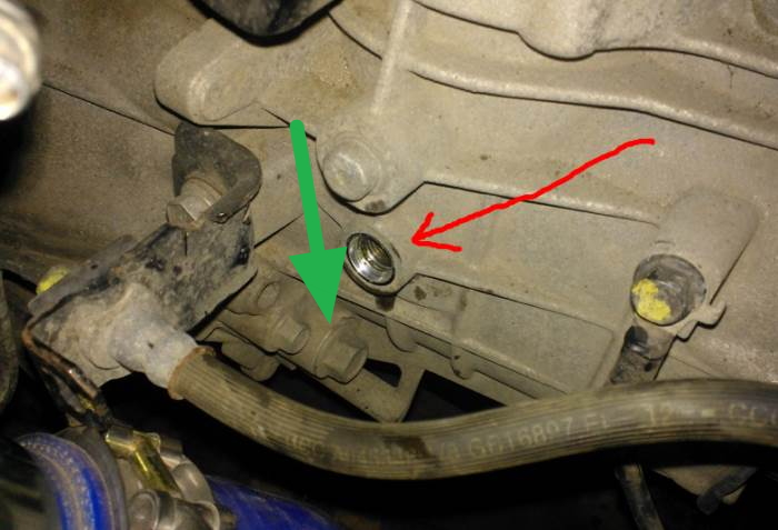 Сегодня менял масло в коробке, влезло около 2 литров. Потекло сразу. Там есть разные пробки. В сети тоже смотрел видео. Там откручивают другую пробку заливную. Она выше и как раз влезет столько как ты говоришь. На правильных пробках слива и залива, есть алюминевые светлые шайбы. Я сегодня на СТО сам чуть не Лоханулся и не начал заливать в пробку которая на много выше. Вот фото где в сети показано красной стрелой (не правильно). А я заливал , где зелёной стрелкой. Там как и у сливной - есть шайба. Влезло как раз около 2 литров. |