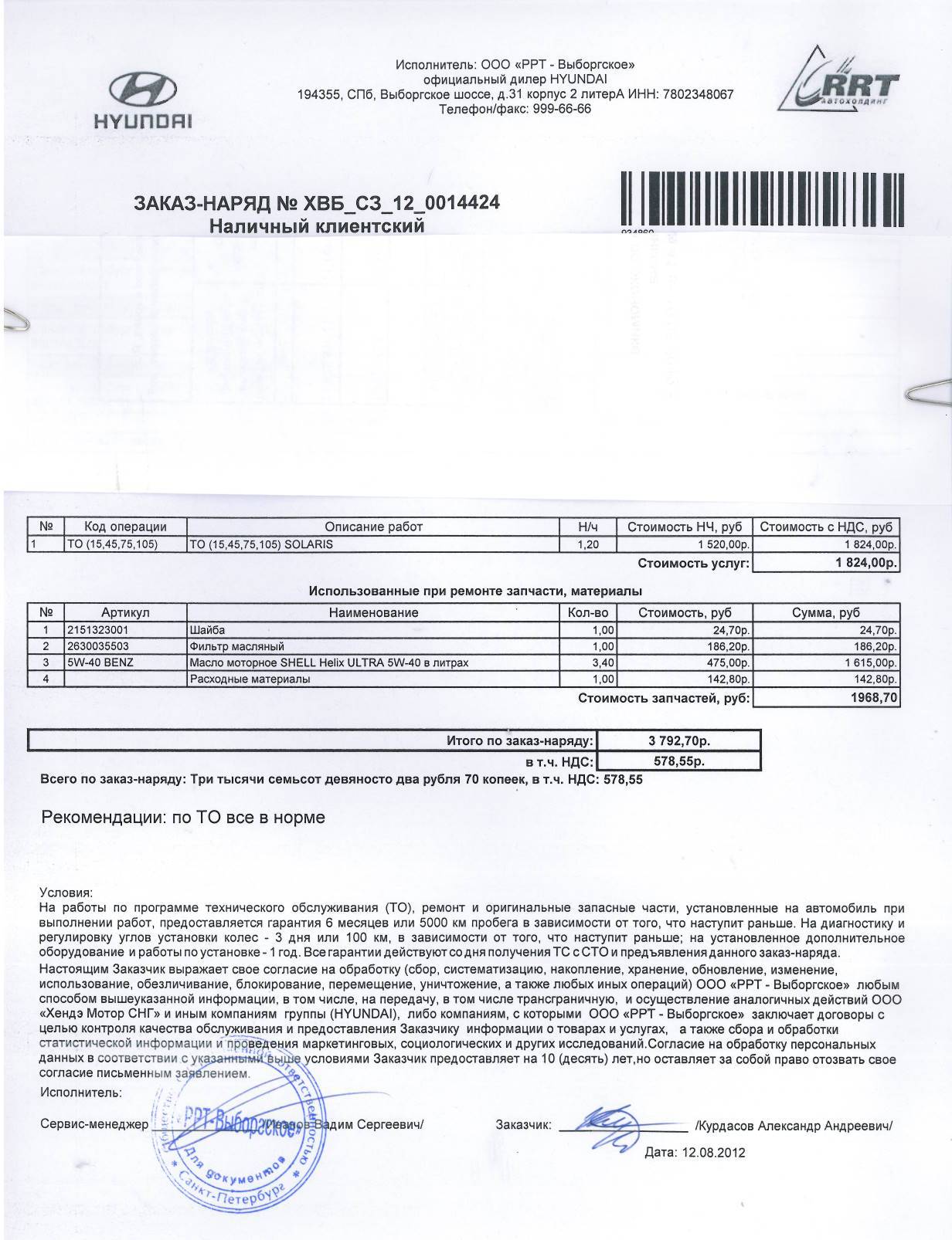 Прошел ТО-1 в Модус-Краснодар. Стоимость ТО с учетом замены масла 2730руб. От доп.услуг отказался, т.е. сказал что только по минимуму, т.к. пробег у авто был на момент ТО 4100км всего. Единственное, что огорчило подсунули из бочки масло попроще: Шелл НХ8 вместо Ультра. Понял, что в след раз нужно приезжать к ОД со своими материалами. А так в Модусе сами не знают что они заливают - одни говорят что ультра, другие что Ультра полар, а в итоге в распечатке совсем другое. Видно, что Модус-Краснодар масло в бочках берет что подешевше :) |
